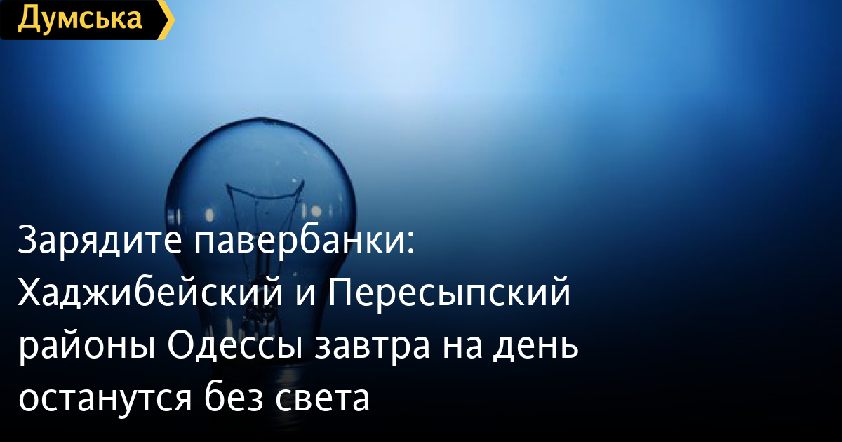 Зарядите павербанки: Хаджибейский и Пересыпский районы Одессы завтра на день останутся без светаАварийный ремонт оборудования проведут завтра энергетики в Хаджибейском и Пересыпском районах Одессы. Как сообщили в ДТЕК, для безопасности работ будет временно отключено электричество с 9:00 до 19:00. Объекты критической инфраструктуры останутся со светом. В случае объявления воздушной тревоги сроки работ могут быть продлены. Специалисты предупреждают, что после окончания ремонта подача света в дома жителей будет восстанавливаться постепенно, поэтому потребуется время. СМЕРТЬ РОССИЙСКИМ ОККУПАНТАМ! Заметили ошибку? Выделяйте слова с ошибкой и нажимайте control-enter |