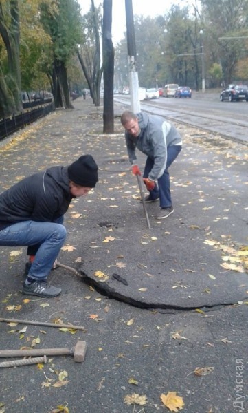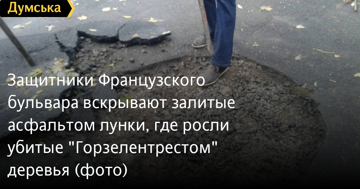 На Французском бульваре активисты движения «Генеральный протест» убирают асфальтовые заплатки, которыми закрыли лунки, где росли загубленные «Горзелентрестом» деревья.