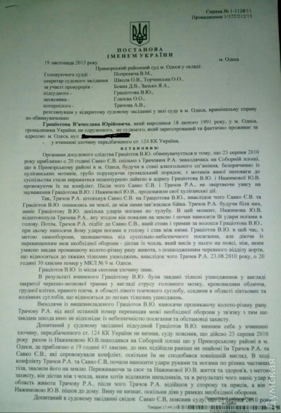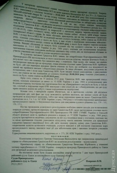 Это решение было обжаловано, и апелляционный суд вернул дело в Приморский суд на повторное рассмотрение. Дело было распределено бывшему судье Киевского районного суда города Донецка Виктору Попревичу, который перешел на работу в Приморский суд Одессы. На сегодняшнем заседании Попревич удовлетворил ходатайство потерпевших (семьи Трачева) и постановил направить дело на дополнительное расследование. Теперь прокуратура должна будет «оперативным путем установить очевидцев преступления», совершенного больше пяти лет назад, установить орудие преступления и проверить заявление Грациотова о том, что сотрудники милиции применяли в отношении него силу.