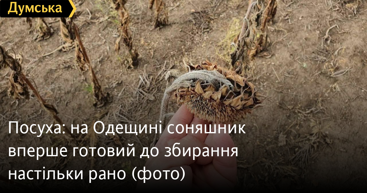 Посуха: на Одещині соняшник вперше готовий до збирання настільки раноСоняшник, який росте на полях Одеської області, вже готовий до збирання, хоча зазвичай це відбувається наприкінці серпня. Як розповіла директор регіонального департаменту аграрної політики, продовольства та земельних відносин Алла Стоянова, цього року встановлено своєрідний рекорд: так рано ця культура ще не дозрівала. Чиновник пов'язала те, що відбувається, з посухою. Збиральна кампанія в області завершується. Одеські аграрії зібрали вже 99% пшениці та намолотили 2,5 мільйони тонн зерна. СМЕРТЬ РОСІЙСЬКИМ ОКУПАНТАМ! Помітили помилку? Виділяйте слова з помилкою та натискайте control-enter