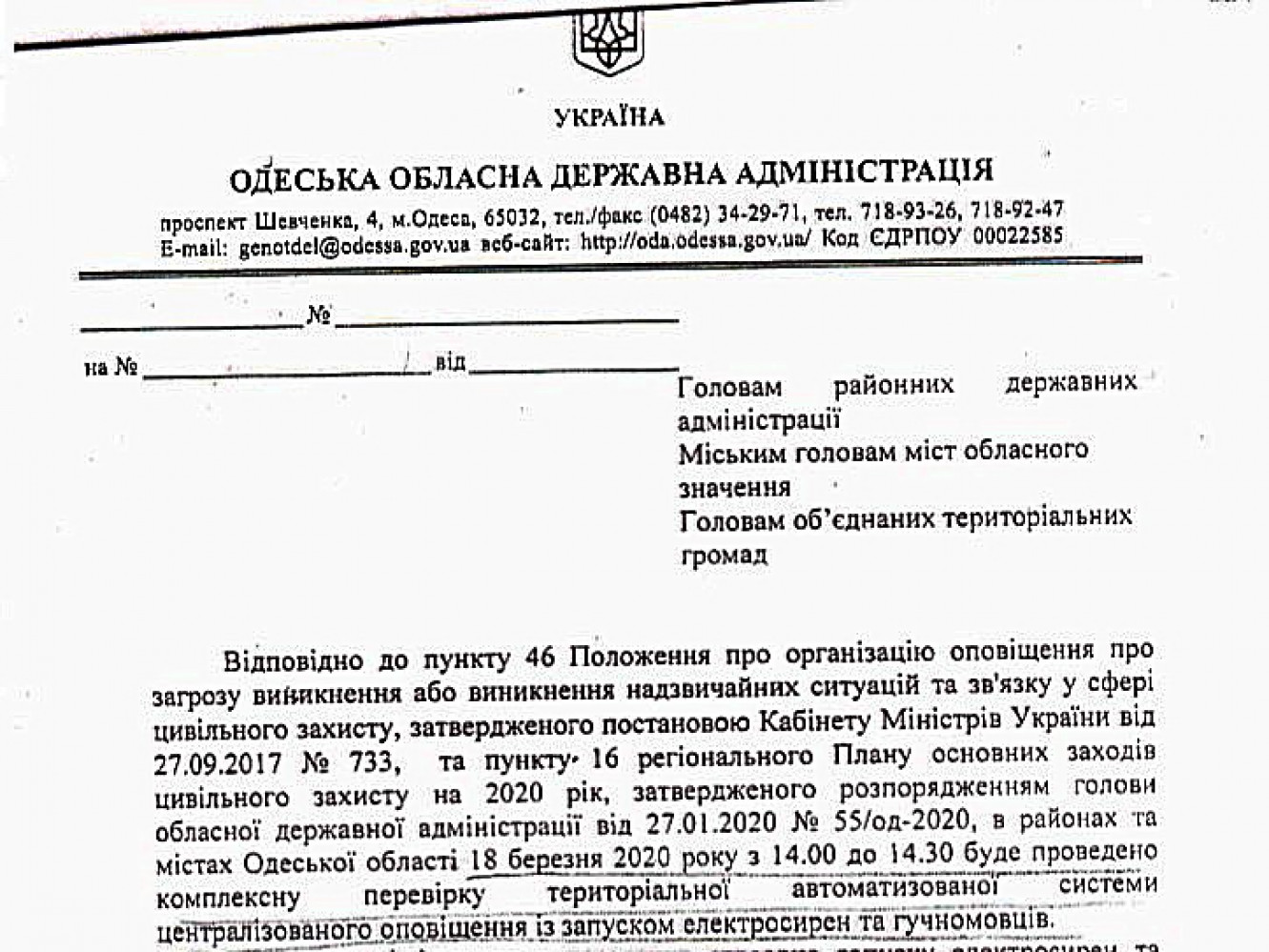 Завтра, 18 марта, в Одессе и области состоится плановый запуск электросирен и громкоговорителей. Как сообщает пресс-служба Одесского горсовета, сирены будут включаться поочередно в каждом районе города в период с 14:00 до 14:30. Проверка системы централизованного оповещения проводится в соответствии с региональным планом основных мероприятий гражданской защиты на 2020 год. Аналогичные проверки в это же время (18 марта с 14:00 до 14:30) будут проводиться и во всех районах области. «Просим жителей не пугаться и сохранять спокойствие», — говорится в предупреждении Ренийской райгосадминистрации. СМЕРТЬ РОСІЙСЬКИМ ОКУПАНТАМ! Помітили помилку? Виділяйте слова з помилкою та натискайте control-enter |