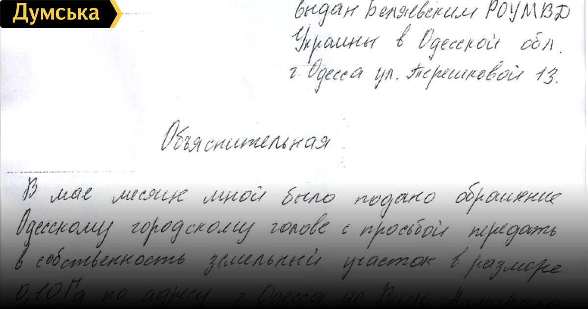 А сама объяснительная: «Указанная просьба исходила от начальника Одесского городского управления земельных ресурса (с теми же ошибками)» и далее по тексту Кто-то может себе представить ту же Коврижных, бегающую по городу и первым встречным предлагающую незаконно оформить на себя землю в «Отраде»?