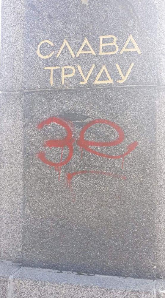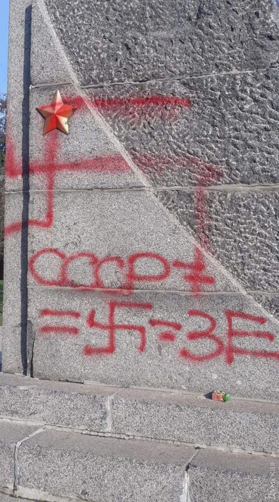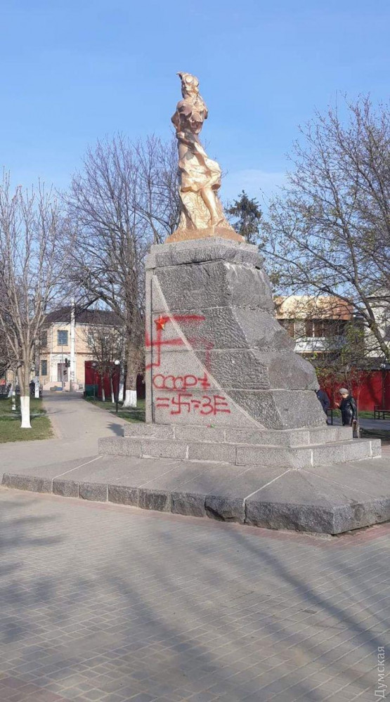 На постаменте изваяния появились надписи «Зе», «СССР» и нацистская свастика, передает корреспондент «Думской».