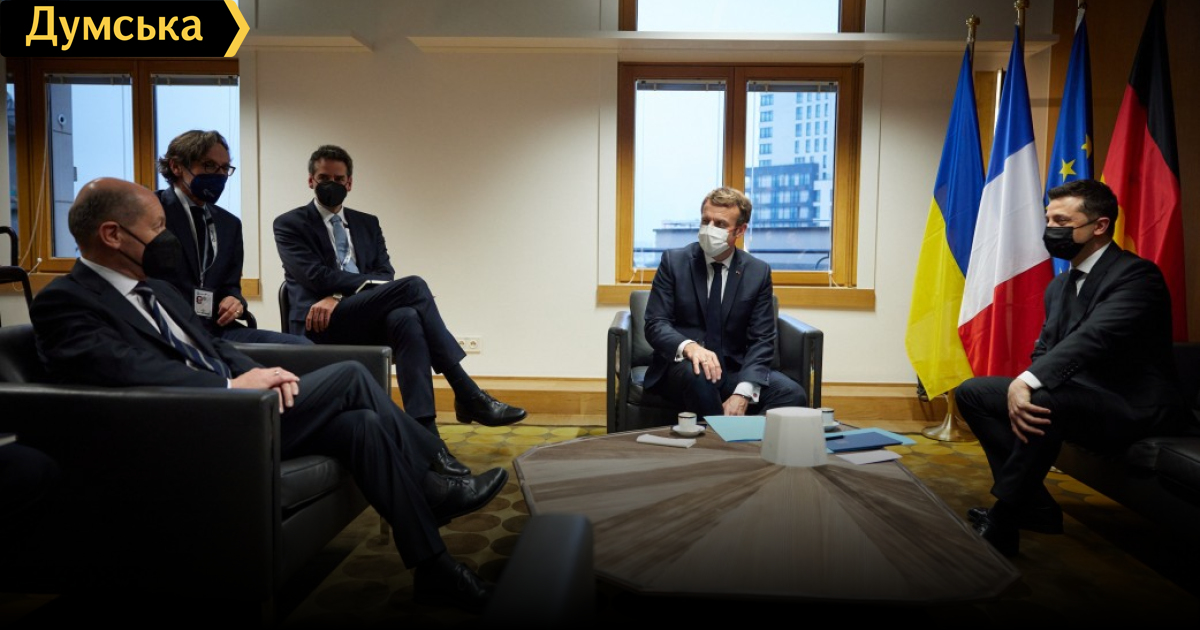 Зеленский обсудил с Макроном и новым канцлером Германии урегулирование конфликта на ДонбассеСегодня в Брюсселе состоялась встреча президента Украины Владимира Зеленского с канцлером Германии Олафом Шольцом и президентом Франции Эммануэлем Макроном, в ходе которой они обсудили урегулирование конфликта на Донбассе. Как сообщила пресс-служба Офиса президента, Зеленский в ходе переговоров поблагодарил Германию и Францию за решительную поддержку Украины на фоне военной угрозы со стороны России, а также за последовательные усилия стран в рамках нормандского формата. Глава государства подчеркнул, что Украина не поддается на провокации на границе, не имеет агрессивных намерений против других стран, а также остается преданной дипломатическим средствам урегулирования ситуации. «Ожидаю, что российские войска и вооружения будут отведены от границ Украины как можно скорее. Пока что, несмотря на продолжающиеся дипломатические усилия, они остаются у наших границ», — заявил президент Украины. Стороны согласились продолжить активную работу в нормандском формате и обеспечить выполнение решений, принятых в Париже 9 декабря 2019 года. Зеленский отметил, что это касается в первую очередь таких мер, как обеспечение соблюдения режима прекращения огня, взаимное освобождение политзаключенных и открытие двух новых пунктов пропуска. СМЕРТЬ РОСІЙСЬКИМ ОКУПАНТАМ! Помітили помилку? Виділяйте слова з помилкою та натискайте control-enter