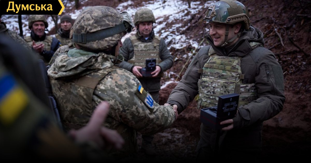 Зеленский отправился на Донбасс и вручил военнослужащим государственные наградыПрезидент Владимир Зеленский сегодня побывал на передовых позициях украинской армии в зоне проведения Операции объединенных сил и поздравил военных с Днем Вооруженных сил Украины. Глава государства пообщался с военнослужащими и вручил пятерым из них государственные награды. «Имею честь сегодня быть вместе с вами. Благодарю вас за то, что защищаете суверенитет и территориальную целостность Украины», – заявил Зеленский. Он также ознакомился с оперативной ситуацией в зоне проведения ООС и осмотрел командный пункт одной из бригад ВСУ. СМЕРТЬ РОСІЙСЬКИМ ОКУПАНТАМ! Помітили помилку? Виділяйте слова з помилкою та натискайте control-enter