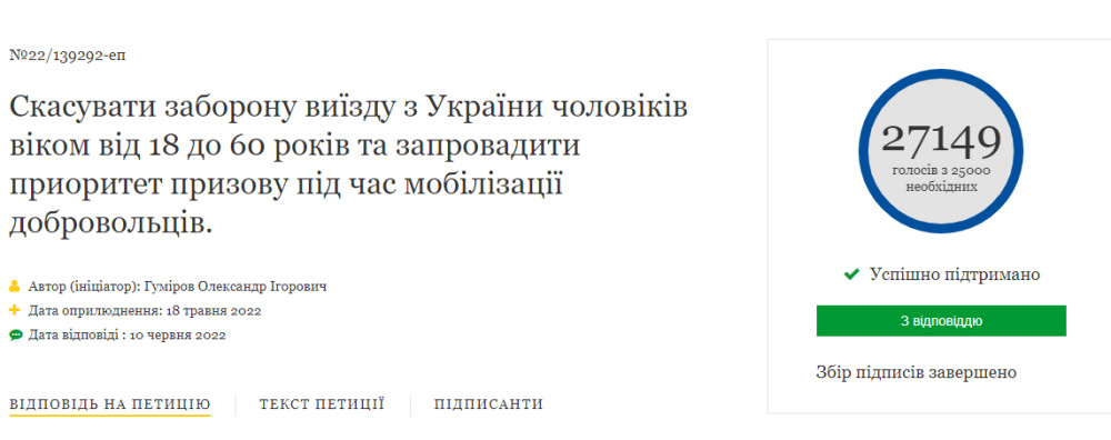 Напомним, петиция предлагает «Отменить запрет выезда из Украины мужчин в возрасте от 18 до 60 лет и ввести приоритет призыва во время мобилизации добровольцев». Она уже набрала более 27 тысяч голосов.