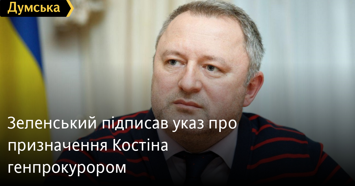 Зеленський підписав указ про призначення Костіна генпрокуроромПрезидент України Володимир Зеленський призначив одесита Андрія Костіна генеральним прокурором України. Про це йдеться в указі №538/2022. «Призначити Костіна Андрія Євгеновича генеральним прокурором», – йдеться у документі. Нагадаємо, що Верховна Рада 27 липня підтримала призначення Андрія Костіна генеральним прокурором України. Андрій Костін – народний депутат дев'ятого скликання, член партії «Слуга народу». Голова Комітету Верховної Ради України з питань правової політики. Костін, у свою чергу, вже затвердив на посаді керівника Спеціалізованої антикорупційної прокуратури Олександра Клименка. Помітили помилку? Виділяйте слова з помилкою та натискайте control-enter