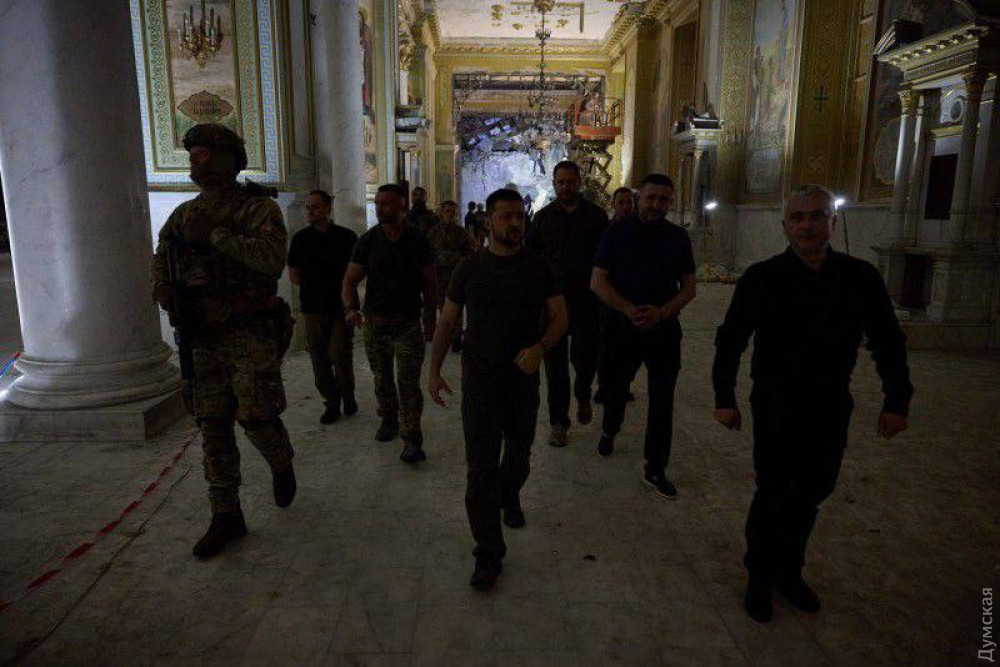 Як повідомляють очевидці, голова держави побував у Свято-Преображенському соборі, у який кілька днів тому прилетіла ворожа ракета.