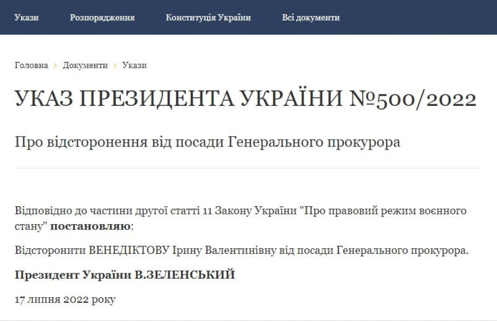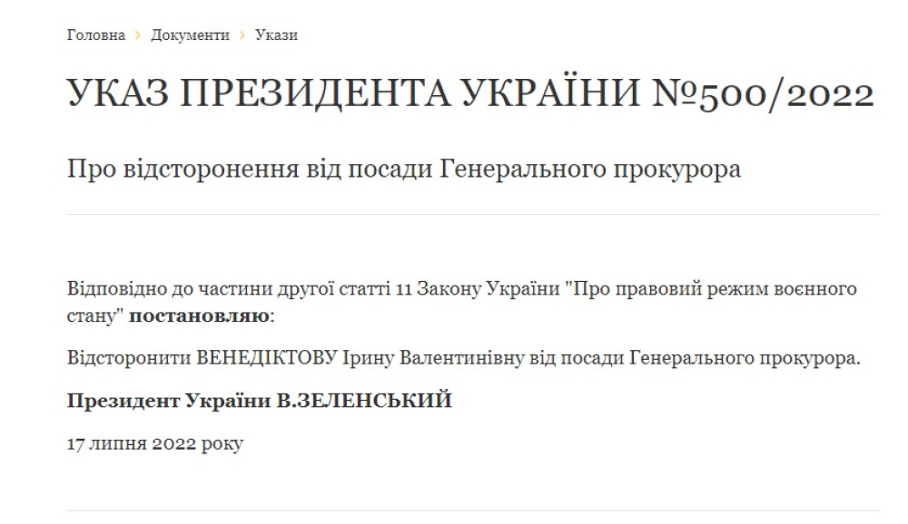 Президент України Володимир Зеленський відсторонив Ірину Венедиктову від посади генерального прокурора України.