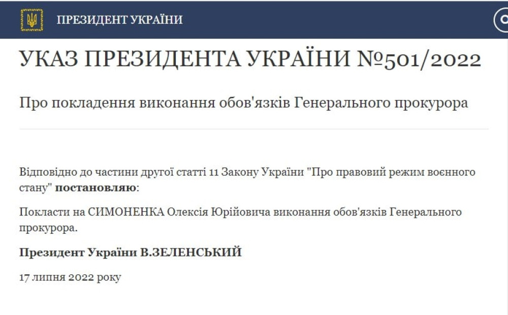 Виконувати обов’язки генпрокурора буде Олексій Симоненко.