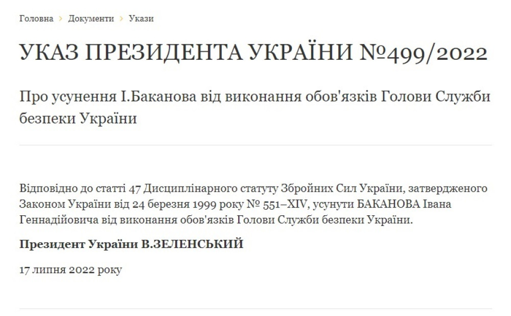 Згідно з указом президента, голову СБУ Баканова усунули від виконання обов'язків відповідно до ст. 47 Дисциплінарного статуту Збройних сил України, я якій вказано: «Невиконання (неналежне виконання) службових обов'язків, що призвело до людських жертв чи інших тяжких наслідків або створило загрозу настанню таких наслідків, є підставою для усунення такого військовослужбовця від виконання службових обов'язків».
