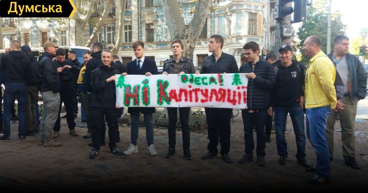 Зеленского в Одессе встречают противники капитуляции с плакатами