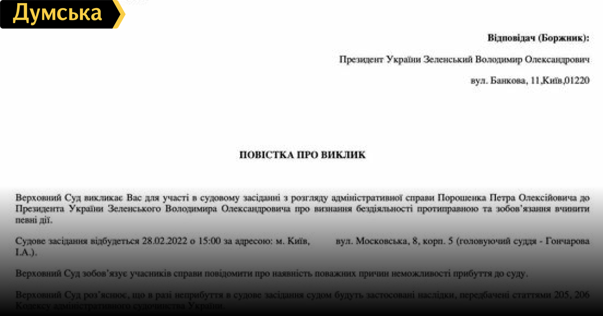Верховный суд вызвал президента Украины Владимира Зеленского на судебное заседание по административному делу по иску лидера «Европейской солидарности» Петра Порошенко. Повестку на допрос опубликовал в Фейсбук адвокат Порошенко Игорь Головань. В повестке сказано, что заседание запланировано на 15:00 28 февраля 2022 года. Председательствующей по делу указана судья Ирина Гончарова. СМЕРТЬ РОСІЙСЬКИМ ОКУПАНТАМ! Помітили помилку? Виділяйте слова з помилкою та натискайте control-enter