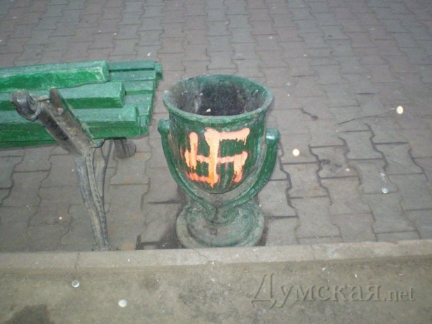 Сотрудники коммунального предприятия «Горзелентрест» обнаружили изображения фашистской свастики на Соборной площади Одессы.
