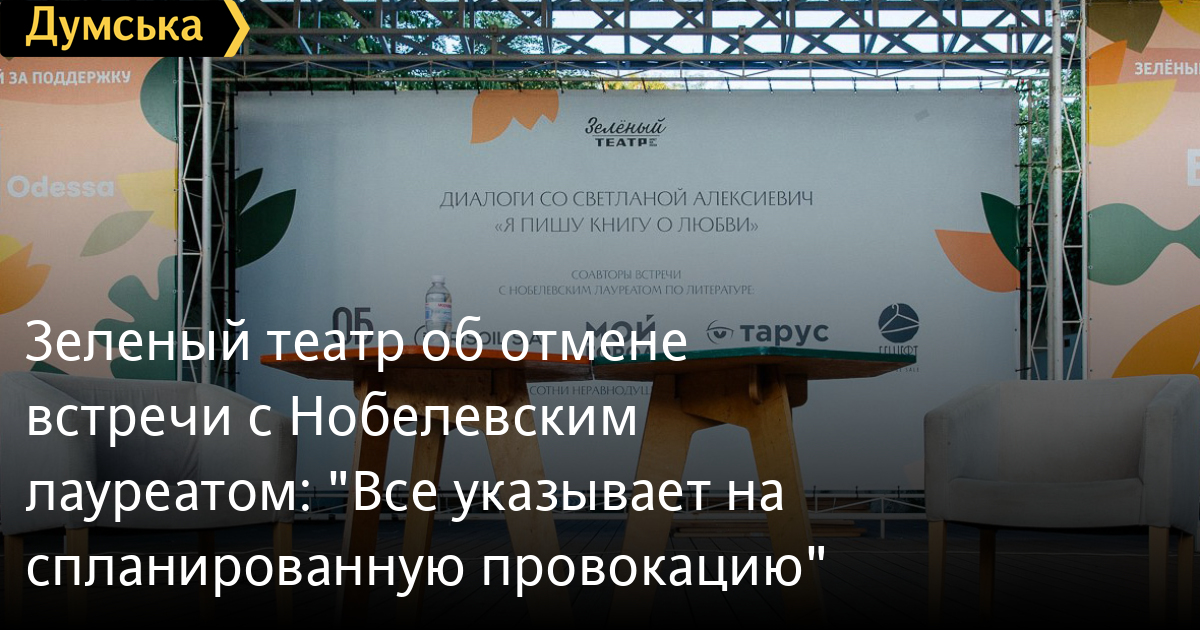 «В связи с общественным резонансом и домыслами, которые распространяют отдельные СМИ, Зеленый театр публикует детальную позицию по отмене встречи со Светланой Алексиевич, которая должна была состояться 8 августа в 20:00. Вместе со всеми одесситами Зеленый театр ждал встречи с Нобелевским лауреатом по литературе. Во вторник, 7 августа, Светлана прибыла в Одессу, в полной готовности увидеться и пообщаться с одесситами.
