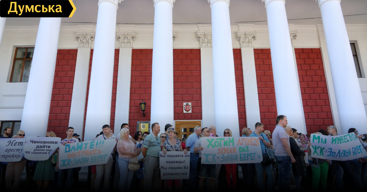 Сегодня с самого утра инвесторы ЖК «Золотой берег» пикетировали здание городского совета, где заседает земельная комиссия. Инвесторы разделились на два лагеря. Большая часть из них на стороне кооператива «Морской 1», который недавно взялся за замороженный почти 10 лет назад жилой комплекс на 16-й станции Большого Фонтана и обещает его достроить. Вторая часть инвесторов не верит «Морскому 1« и опасается, что их снова обманут.