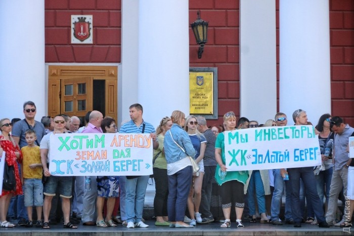 Сегодня с самого утра инвесторы ЖК «Золотой берег» пикетировали здание городского совета, где заседает земельная комиссия.