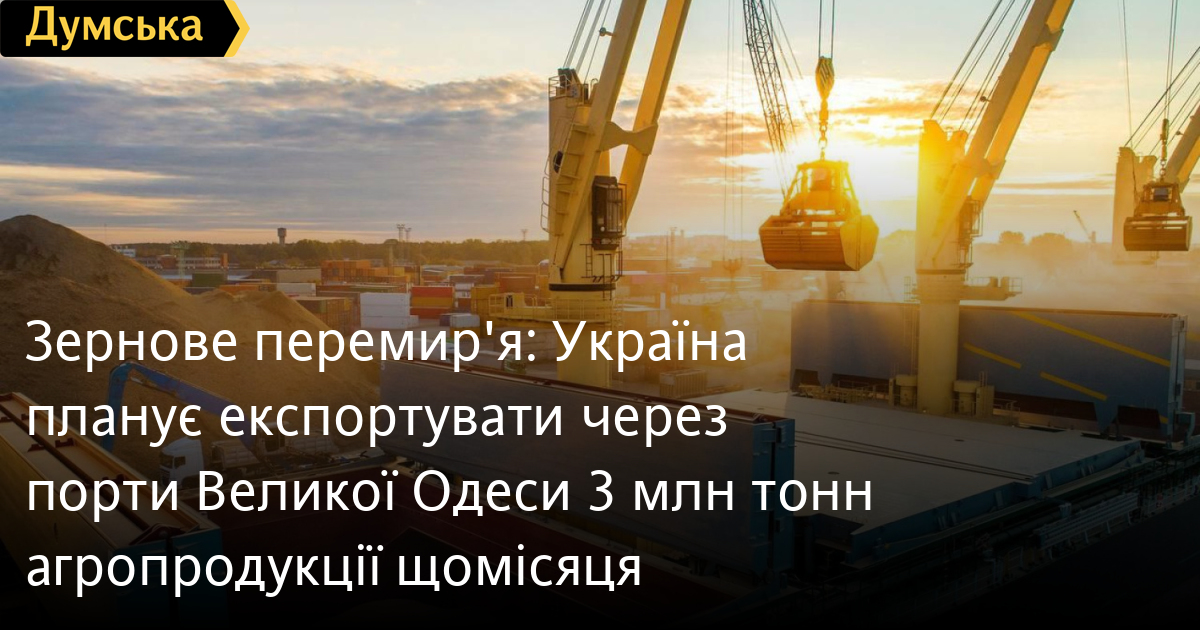 3 млн тонн різної агропродукції щомісяця планує експортувати через порти Великої Одеси (Одеса, Чорноморськ, Південний) українська влада в рамках так званого «зернового перемир'я».