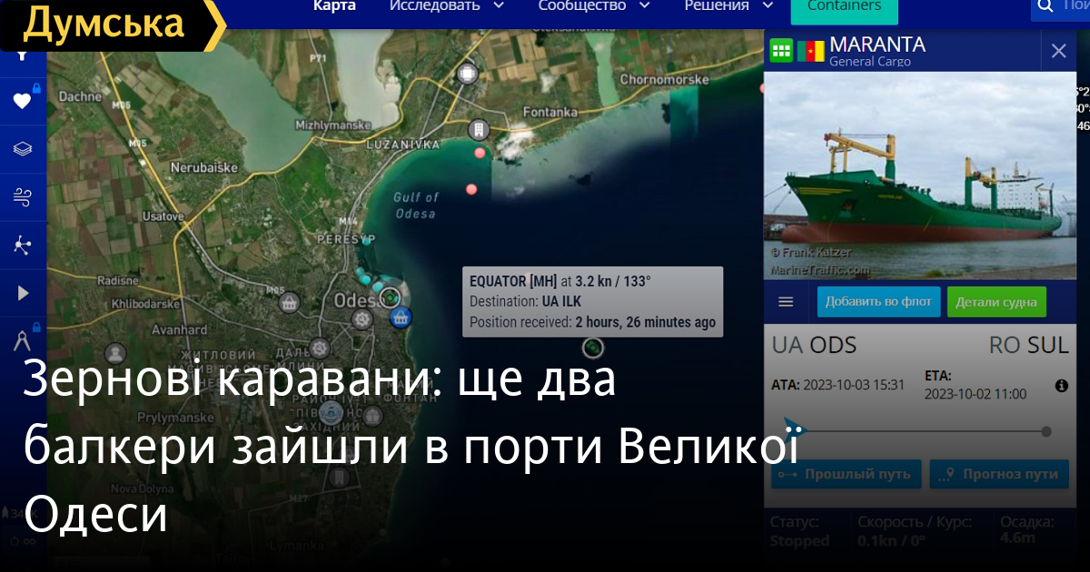 Зернові каравани: ще два балкери зайшли в порти Великої ОдесиДва нові судна зайшли в порти Одеської області 3 жовтня. Балкери Equator і Maranta вранці пройшли новим транспортним коридором, контрольованим Військово-морськими силами України. Обидва судна мають порівняно невеликі розміри. Equator завдовжки 140 метрів, Maranta — 100 метрів. Зараз у портах Великої Одеси під завантаженням перебуває сім суден — п'ять прибули в неділю, 1 жовтня. Незабаром усі вони вирушать із вантажем зерна до країн Африки та Європи. Ще чотири судна із зерном і одне з вантажем залізної руди вже пройшли Босфор і рухаються до портів призначення. Нагадаємо, новий тимчасовий коридор для торгових суден відкрито 10 серпня цього року. Першими ним скористалися судна, заблоковані в портах Великої Одеси від початку повномасштабного вторгнення рф. СМЕРТЬ РОСІЙСЬКИМ ОКУПАНТАМ! Помітили помилку? Виділяйте слова з помилкою та натискайте control-enter |