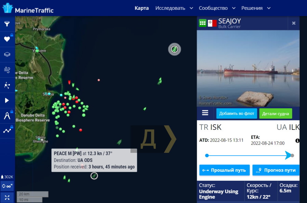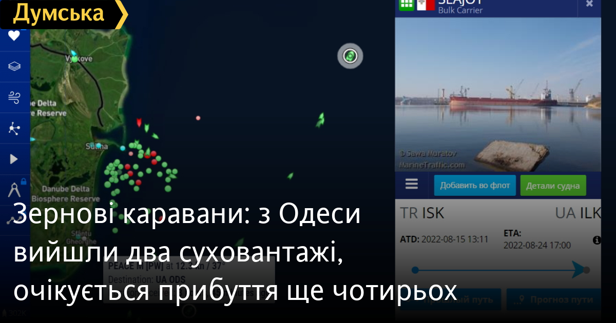 Ще один караван вирушив зранку від узбережжя Румунії до портів Великої Одеси. Балкер SEAJOY під прапором мальтійським і ANASTASYA під прапором Палау йдуть до Чорноморська, а FPMC B 201 під ліберійським прапором і PEACE M під прапором Палау пришвартуються в Одесі.