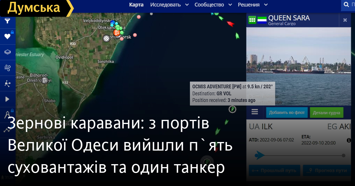 Суховантажі QUEEN SARA та ORIS PRINCESS вийшли з порту Чорноморськ, NEW LEVANT та IRMGARD — з Одеси, а танкер VITIS та балкер OCMIS ADVENTURE – з порту Південний.