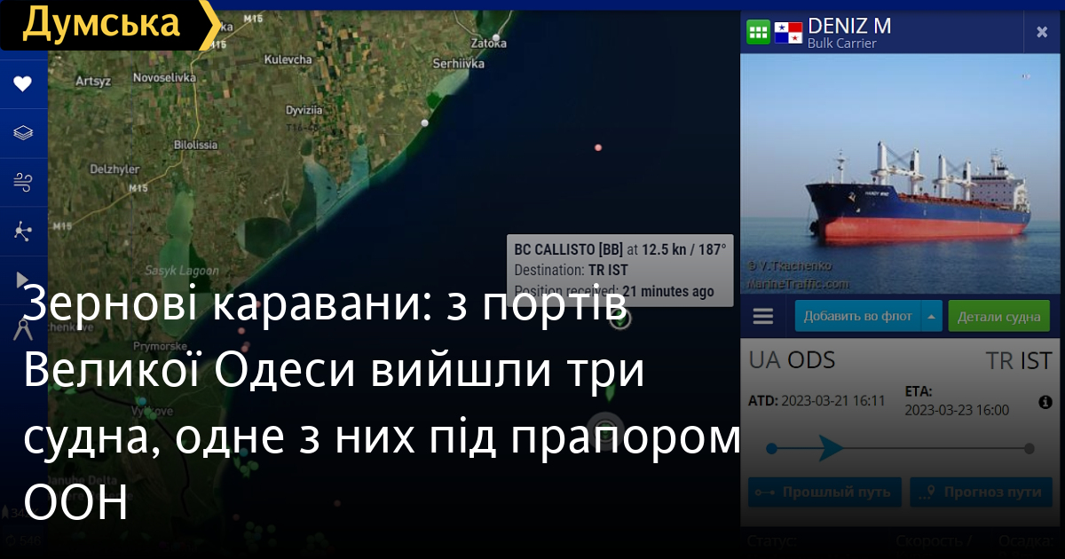 Зернові каравани: з портів Великої Одеси вийшли три судна, одне з них під прапором ООНТри суховантажі, навантажені українською агропромисловою продукцією, вийшли вранці 22 березня з портів Великої Одеси. Очолив караван балкер Deniz M, зафрахтований Всесвітньою продовольчою програмою ООН. За ним ідуть IOANNIS THEO і BC CALLISTO. Deniz M - сімнадцяте судно, орендоване в рамках Ініціативи з безпечного транспортування зерна і продуктів харчування, в його трюмах 30 тисяч тонн пшениці в якості гуманітарної допомоги для Ефіопії. Ioannis Theo доставить 52 тисячі тонн пшениці до В'єтнаму, а BC Callisto 30,5 тисяч тонн пшениці до Алжиру. До одеського узбережжя зерновим коридором сьогодні прибуло чотири судна, вони мають стати під завантаження в трюми близько 122 тисяч тонн продовольства. Загалом, з 1 серпня минулого року, в рамках зернової ініціативи з портів Великої Одеси вийшло 833 судна, якими вдалося експортувати 25,3 мільйона тонн української агропромислової продукції. Помітили помилку? Виділяйте слова з помилкою та натискайте control-enter |