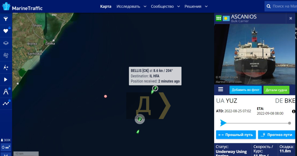Вчора ввечері вийшов із одеського порту і залишився на ніч на якірній стоянці суховантажне судно ALI S під прапором Федерації Сент-Кітс і Невіс. Сьогодні о 7-й годині ранку з порту Південний вийшов балкер ASCANIOS під прапором Палау. Він прямує до німецького порту Brake. За годину одеський порт залишив BELLIS під прапором Островів Кука. Він іде до ізраїльського порту Хайфа.