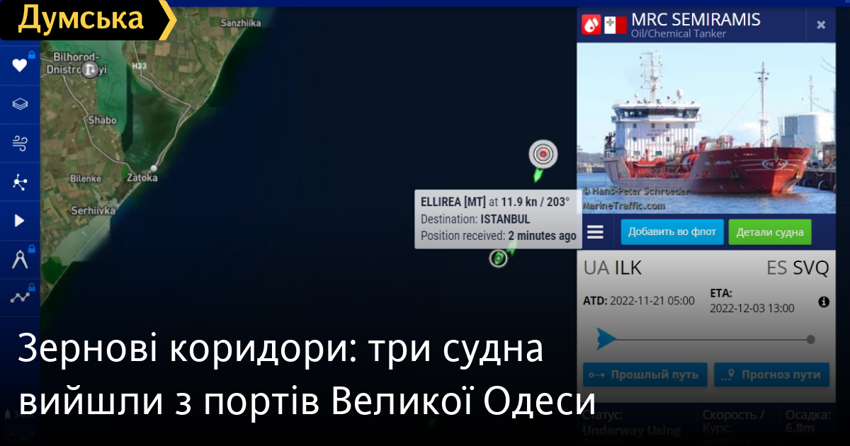 Зернові коридори: три судна вийшли з портів Великої ОдесиТри судна вирушили сьогодні зерновим коридором від одеського узбережжя до протоки Босфор. Суховантажі ELLIREA та AG VALOR вранці вийшли з порту Південний, а танкер MRC SEMIRAMIS із порту Чорноморськ. На шляху до одеських портів знаходиться чотири балкери, два мають зайти до одеського порту та два до чорноморського. Всього з 1 серпня зерновим коридором із портів Великої Одеси вийшло 486 суден, які вивезли до 38 країн світу близько 11,7 мільйонів тонн української агропромислової продукції. Нагадаємо, «зернова ініціатива», укладена 22 липня між Україною, Туреччиною та ООН, діяла до 19 листопада, проте 17 листопада продовжено ще на 120 діб. СМЕРТЬ РОСІЙСЬКИМ ОКУПАНТАМ! Помітили помилку? Виділяйте слова з помилкою та натискайте control-enter |