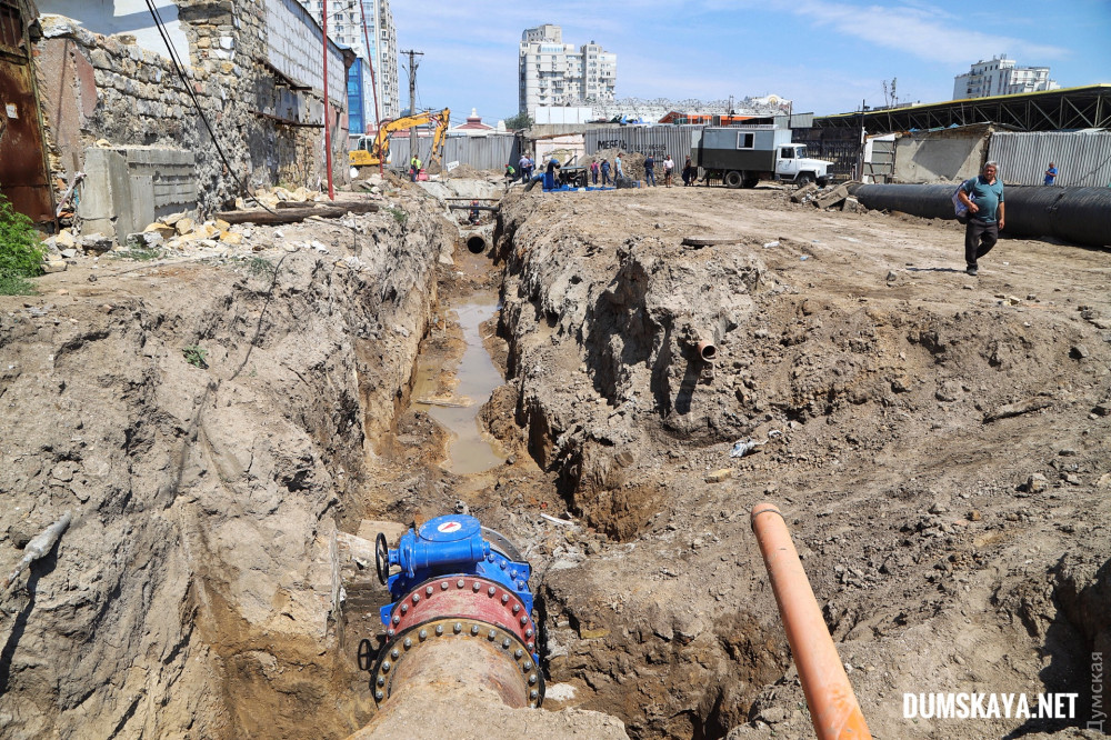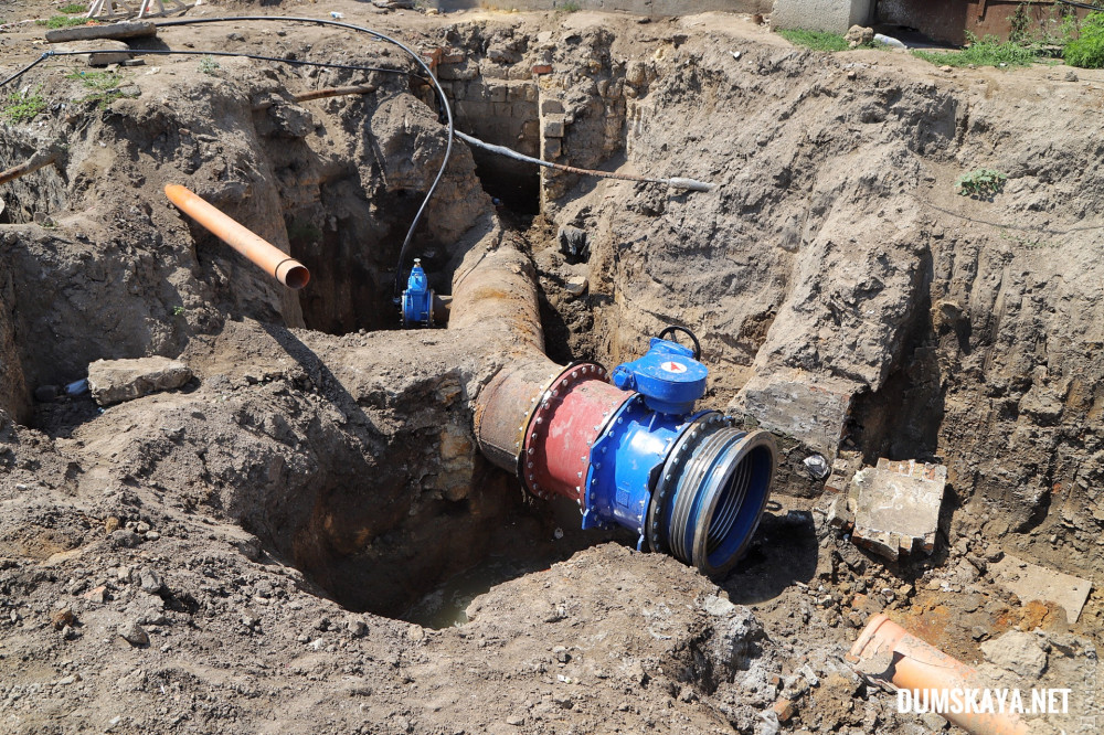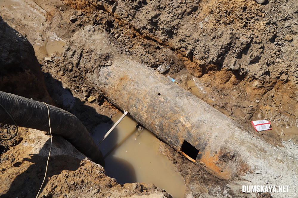 Как передает корреспондент «Думской», между зоопарком и строительным рынком поперек улицы вырыта огромная траншея, из которой извлекли старые железные трубы. Сейчас ремонтники пытаются установить на этом участке муфту, после чего водоснабжение должны возобновить.
