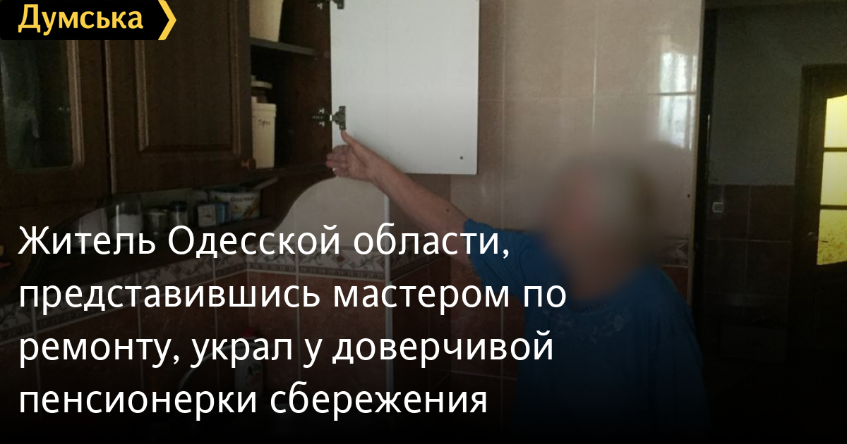 Житель Одесской области, представившись мастером по ремонту, украл у доверчивой пенсионерки сбереженияВ Арцизе Одесской области полиция задержала мужчину, подозреваемого в краже четырех тысяч гривен у пенсионерки. Как сообщила пресс-службы ГУНП, в первый день проведения ремонта в квартире 86-летней женщины работник отправил хозяйку на улицу, чтобы она «не дышала краской», а сам тем временем похитил из кухонного шкафа ее сбережения и сбежал. Обнаружив пропажу денег и не дозвонившись работнику, женщина обратилась в полицию. Правоохранители вскоре установили личность подозреваемого. Им оказался 26-летний ранее судимый местный житель. Он признался, что украденные деньги потратил на собственные нужды. Открыто уголовное производство по ч.1 ст.185 УК Украины (кража). Полиция проверяет фигуранта на причастность к другим аналогичным преступлениям. СМЕРТЬ РОСІЙСЬКИМ ОКУПАНТАМ! Помітили помилку? Виділяйте слова з помилкою та натискайте control-enter Новини по цій темі: 29 липня 2025: В Усатово Одеської області сталася перестрілка: поліція працює на місці (відео, оновлено) 28 липня 2025: П'яний на "Ягуарі" або гіпертонік? Звільнений топ-посадовець одеської поліції хоче повернутися на службу 19 червня 2025: Дівчинку, яку шукали сотні одеситів, знайшли вбитою: поліція працює з чоловіком, ймовірно причетним до загибелі 27 травня 2025: Увели гектар в університету: на Одещині засудили земельних аферистів, але без посадки і Хвоста |