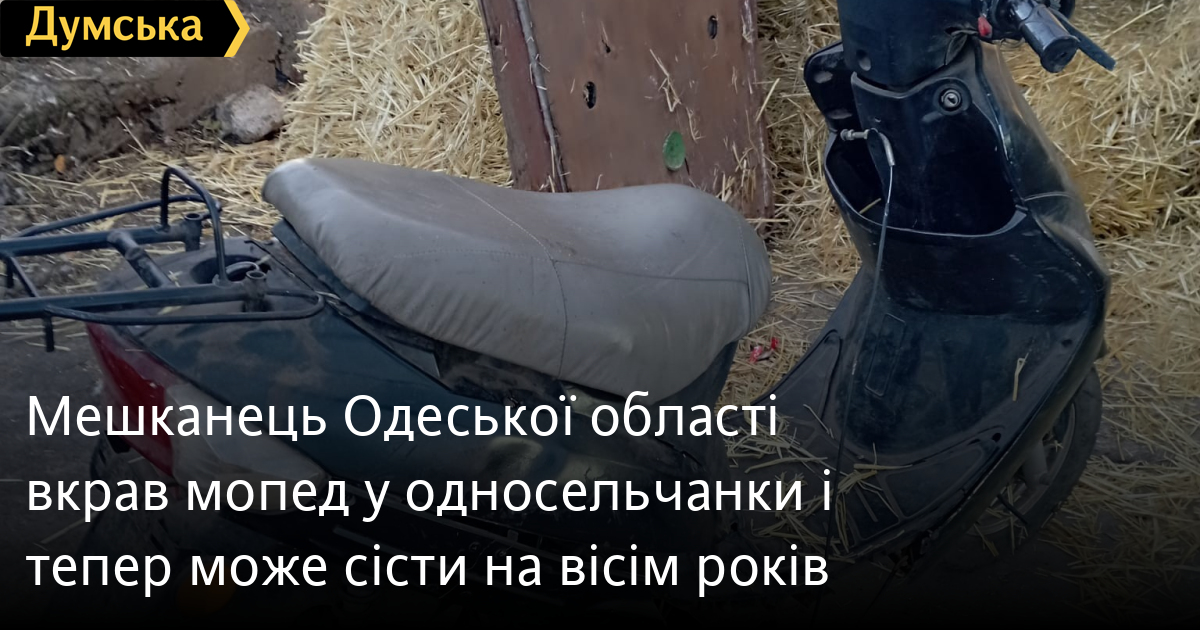 Мешканець Одеської області вкрав мопед у односельчанки і тепер може сісти на вісім роківЖителя Березівського району затримали за крадіжку мопеда в односельчанки. Тепер молодому чоловіку загрожує від п'яти до восьми років позбавлення волі з конфіскацією. Як повідомили у пресслужбі поліції Одеської області, хлопець прийшов у гості до знайомої, і коли вона відволіклася, пробрався до господарського приміщення, забрав мопед і закотив до себе додому, а потім сховав у сінях. Коли жінка вранці не знайшла скутер, вона звернулася до правоохоронців, а ті розшукали зловмисника, який переховувався у родичів. Молодий чоловік зізнався, що хотів перефарбувати мопед і потім ним користуватися. Транспортний засіб правоохоронці повернули власниці, а хлопцю повідомили про підозру за ч. 2 ст. 289 Кримінального кодексу України. Помітили помилку? Виділяйте слова з помилкою та натискайте control-enter Новини по цій темі: 29 липня 2025: В Усатово Одеської області сталася перестрілка: поліція працює на місці (відео, оновлено) 28 липня 2025: П'яний на "Ягуарі" або гіпертонік? Звільнений топ-посадовець одеської поліції хоче повернутися на службу 19 червня 2025: Дівчинку, яку шукали сотні одеситів, знайшли вбитою: поліція працює з чоловіком, ймовірно причетним до загибелі 27 травня 2025: Увели гектар в університету: на Одещині засудили земельних аферистів, але без посадки і Хвоста |