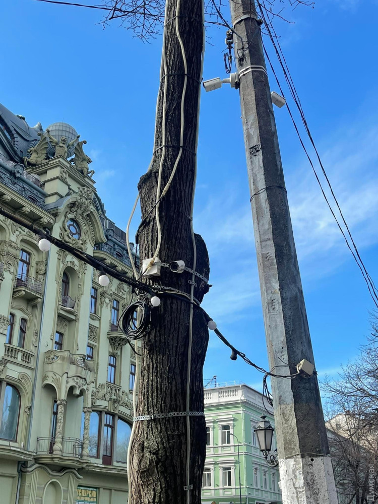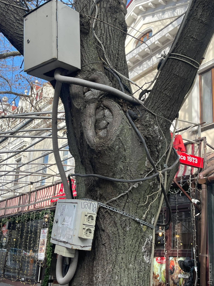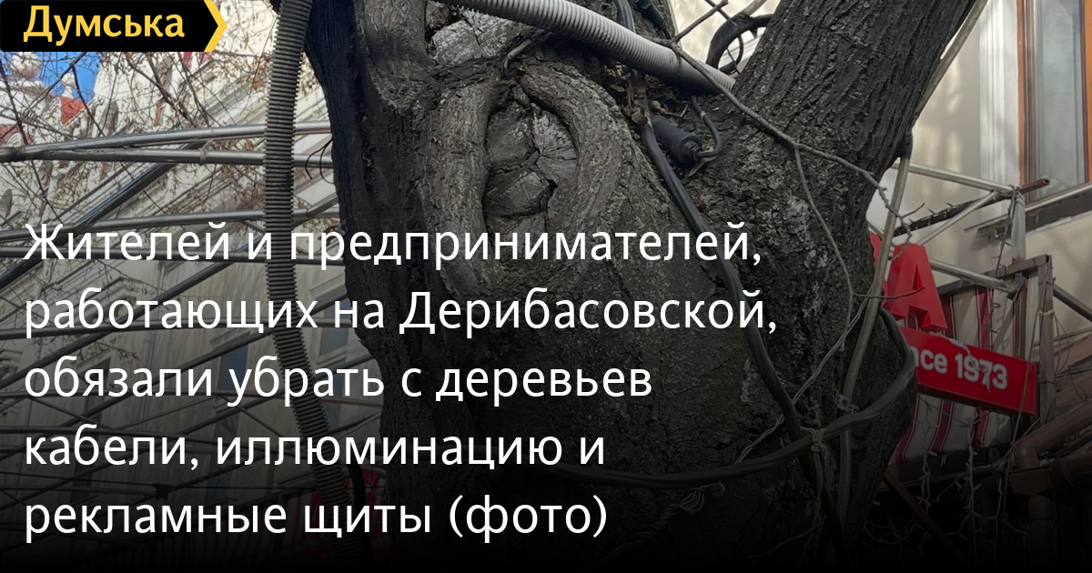 Жителей Дерибасовской и предпринимателей, которые работают на ней, обязали демонтировать свои рекламные щиты, таблички, кабельные линии, иллюминацию и другие конструкции, размещенные на деревьях.