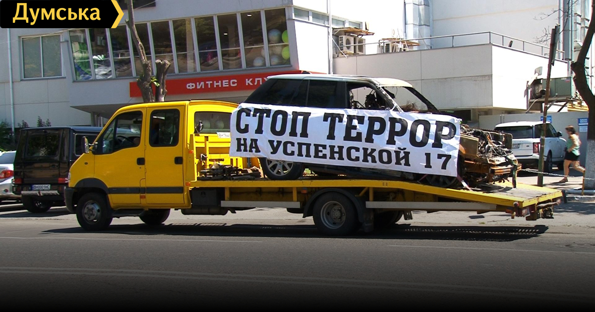 Как напоминание о том, что жители готовы бороться до конца, под здание суда привезли сгоревший внедорожник. На привезенную под суд машину добавили символическую надпись – «стоп террор». Напомним, автомобиль сожгли председателю ОСМД Геннадию Когану 6 июня. Владелец обвиняет в злодеянии застройщика двора на Успенской.
