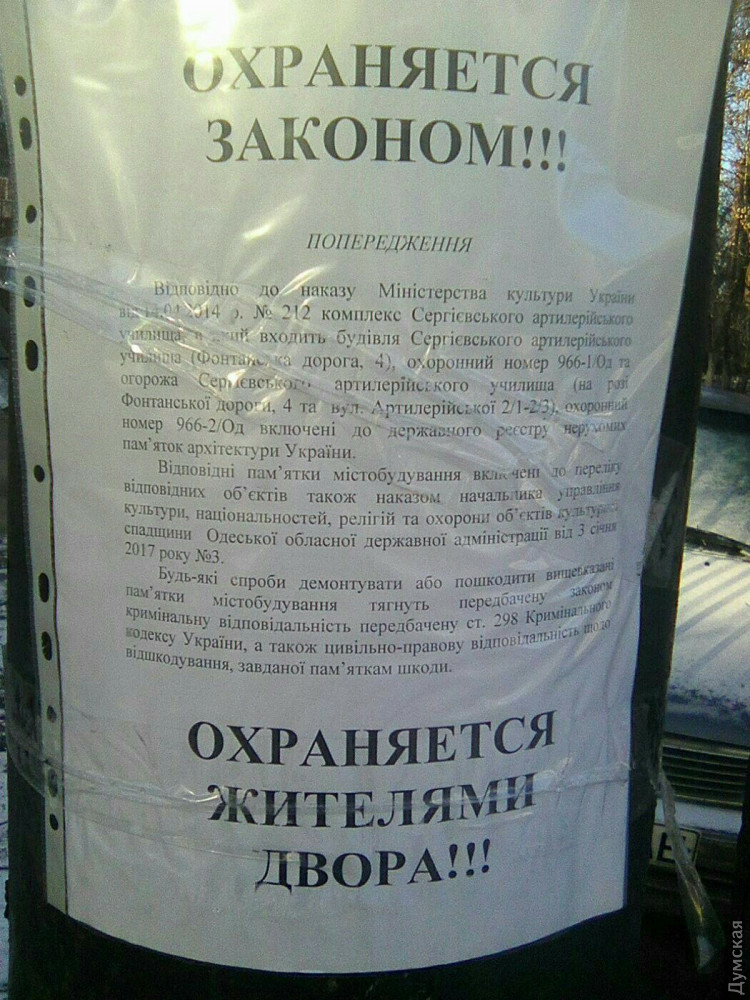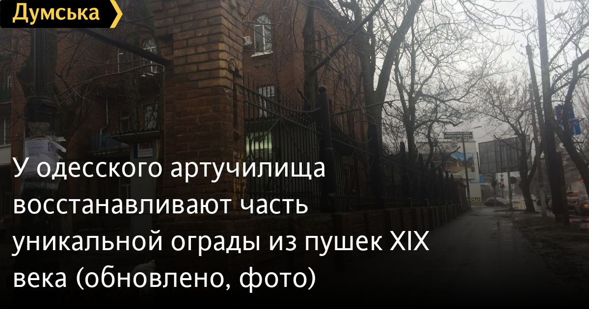 Примерно месяц назад кто-то из жителей двора приклеил бумажные номерки на все орудия забора, а при входе во двор – объявление, согласно которому некие рейдеры под видом ремонта ограды стремятся сломать ее, чтобы похитить 107-мм орудия. При этом в мэрии и облгосадминистрации ни о каких работах на этом объекте культурного наследия не знают, ничего не санкционировали. Автор объявления призывает соседей быть бдительными и чуть что, звонить в полицию.