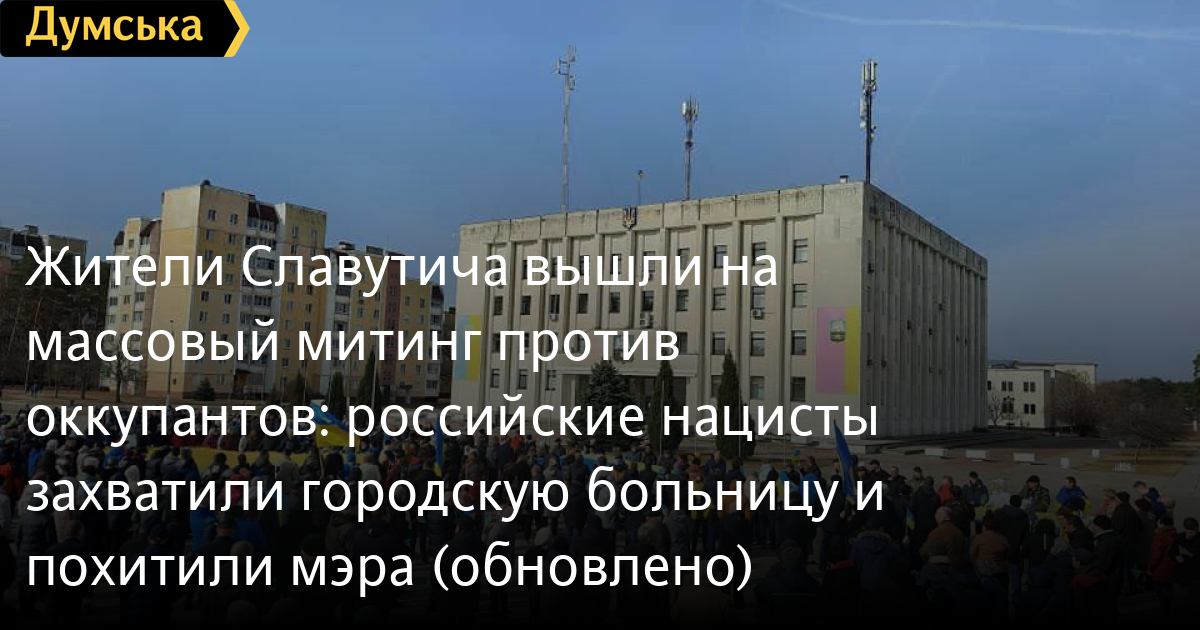 Как сообщает председатель Киевской областной военной администрации Александр Павлюк, люди собираются на главной площади и скандируют: «Славутич – это Украина», «Слава Украине». Развернут большой государственный флаг.