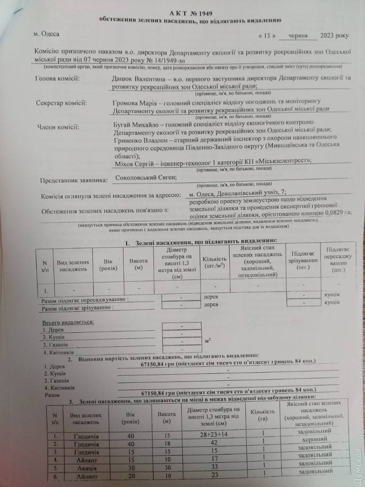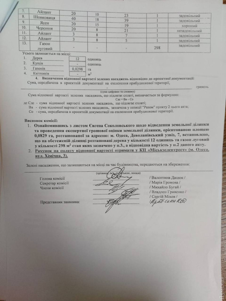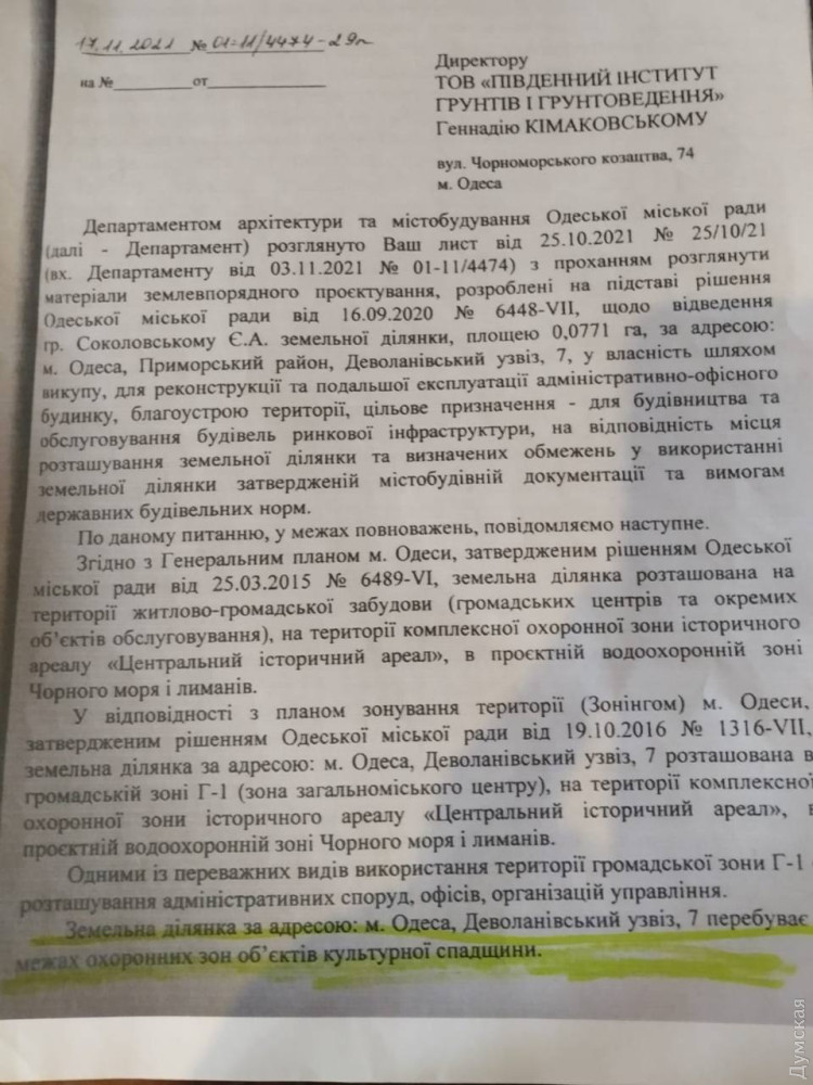 Дійсно, у вересні 2020 року Одеська міська рада дозволила якомусь Євгену Соколовському розроблення проєкту землеустрою земельної ділянки площею 0,0829 га за адресою Деволанівський узвіз, 7 для реконструкції та подальшої експлуатації адміністративно-офісної будівлі.