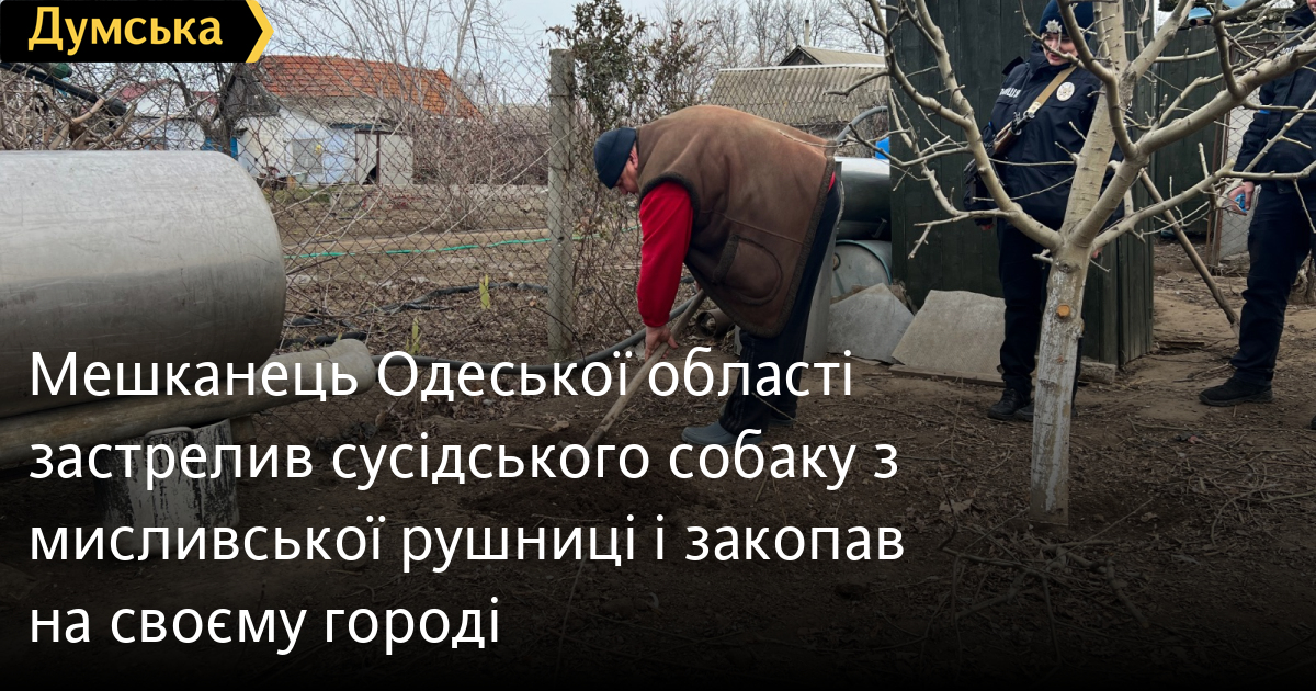 Мешканець Одеської області застрелив сусідського собаку з мисливської рушниці і закопав на своєму городіРозстріляв собаку з мисливської рушниці — у такий спосіб мешканець села Степанівка Роздільнянського району покарав сусідського улюбленця, який, за словами чоловіка, з'їв кількох його курей. Як повідомила пресслужба ГУНП, інцидент стався минулими вихідними. Чоловік прийшов на подвір'я до сусідки і застрелив її собаку з незареєстрованої мисливської рушниці. Тіло вбитого собаки зловмисник забрав із собою і закопав на своєму городі. Поліцію на місце події викликали очевидці. Відкрито кримінальне провадження за ч.1 ст. 299 (жорстоке поводження з тваринами) КК України. Досудове розслідування триває. СМЕРТЬ РОСІЙСЬКИМ ОКУПАНТАМ! Помітили помилку? Виділяйте слова з помилкою та натискайте control-enter Новини по цій темі: 29 липня 2025: В Усатово Одеської області сталася перестрілка: поліція працює на місці (відео, оновлено) 28 липня 2025: П'яний на "Ягуарі" або гіпертонік? Звільнений топ-посадовець одеської поліції хоче повернутися на службу 19 червня 2025: Дівчинку, яку шукали сотні одеситів, знайшли вбитою: поліція працює з чоловіком, ймовірно причетним до загибелі 27 травня 2025: Увели гектар в університету: на Одещині засудили земельних аферистів, але без посадки і Хвоста |