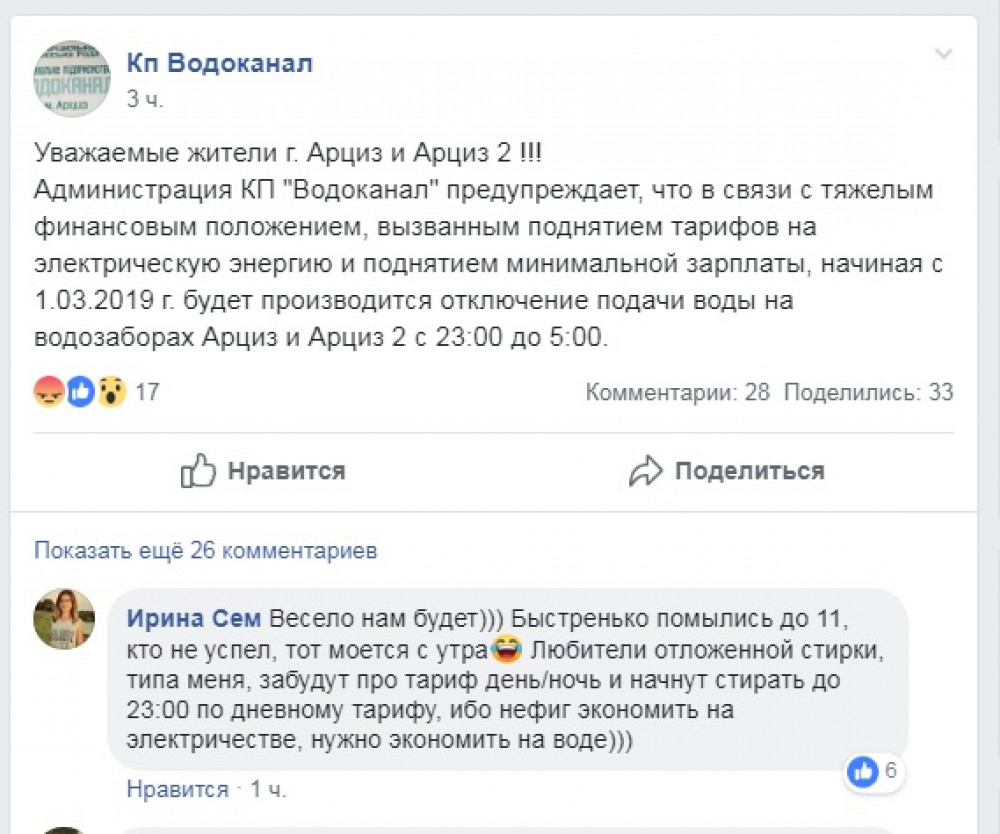 «В связи с тяжелым финансовым положением, вызванным поднятием тарифов на электрическую энергию и поднятием минимальной зарплаты, начиная с 1.03.2019 г. будет производится отключение подачи воды на водозаборах Арциз и Арциз-2 с 23:00 до 5:00», — сообщили сегодня в пресс-службе коммунального предприятия «Водоканал».