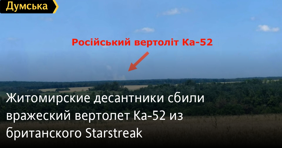 «Военнослужащими подразделения противовоздушной обороны 95-й отдельной десантно-штурмовой бригады Вооруженных Сил Украины из ПЗРК Starstreak был сбит российский разведывательно-ударный вертолет Ка-52 Аллигатор», — сообщили в командовании Десантно-штурмовых войск.