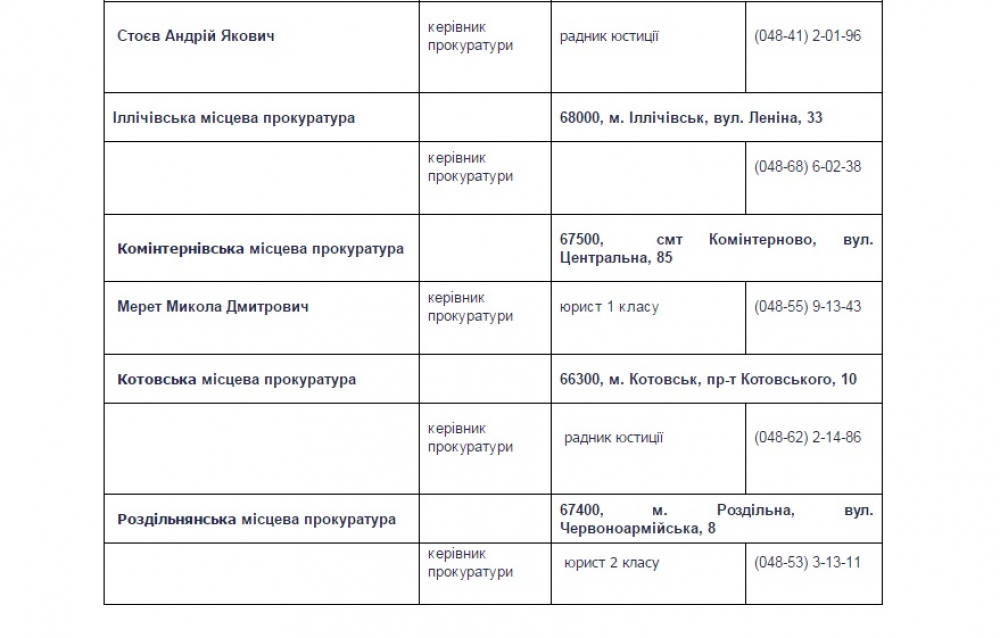 Сразу несколько руководителей местных прокуратур в Одесской области уволены с занимаемых должностей. Об этом свидетельствует информация с сайта прокуратуры области. Впрочем, одно вакантное место уже занято. На днях коллективу Раздельняской местной прокуратуры (охватывает пять районов) представили нового руководителя. Им стал Сергей Стадник, сменивший на этой должности Леонида Злого. Ранее Стадник работал прокурором отдела организации представительства в суде и при исполнении судебных решений прокуратуры Одесской области. Теперь он пошел по стопам отца Александра Стадника, который в свое время возглавлял прокуратуры Ивановского, Болградского и Раздельняского районов, а в прошлом году вышел на пенсию. Обезглавленными пока остаются Котовская и Ильичевская местные прокуратуры. Как сообщалось ранее, прокурор Одесской области Олег Жученко после своего назначения потребовал от всех руководителей структурных подразделений ведомства и местных прокуратур написать заявления об увольнении. СМЕРТЬ РОСІЙСЬКИМ ОКУПАНТАМ! Помітили помилку? Виділяйте слова з помилкою та натискайте control-enter |