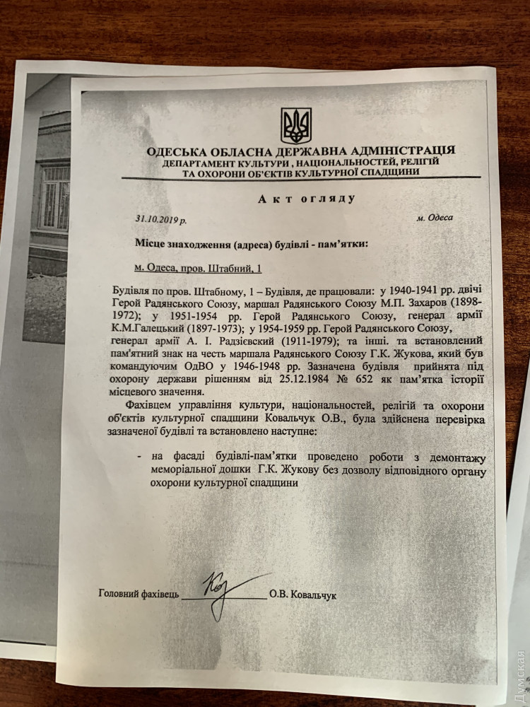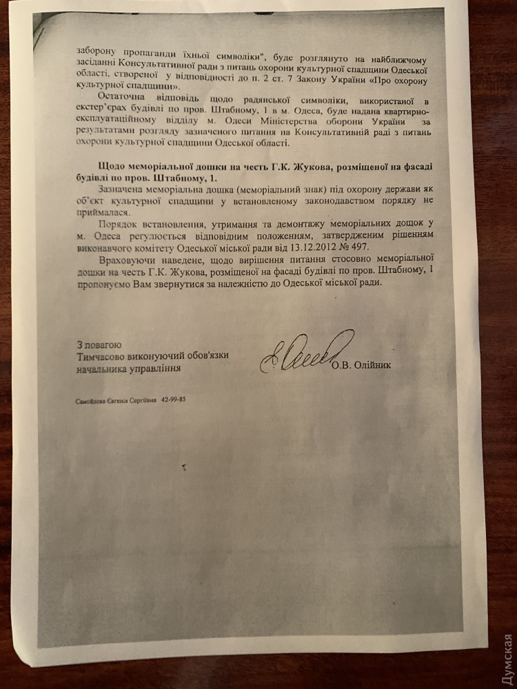 По ее словам, все мемориальные знаки и доски находятся на балансе Одесского горсовета, который должен был обратиться в департамент с соответствующим обращением (согласием) на демонтаж. Муниципалитет ничего не предпринял, хотя его неоднократно информировали о нарушении Закона «Об осуждении коммунистического и национал-социалистического (нацистского) тоталитарных режимов»: Труханов является открытым противником этого нормативного акта и восхищается Жуковым и другими лицами, подпадающими под действие закона.