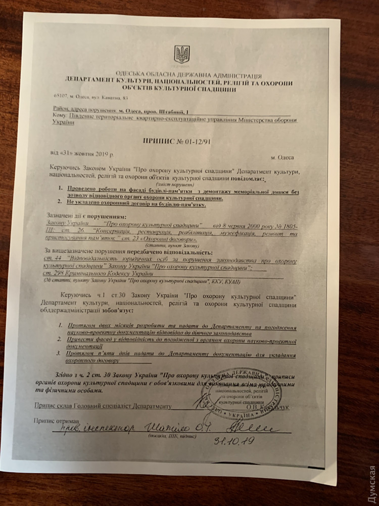 Кроме того, в течение пяти дней Южное территориальное квартирно-эксплуатационное управление Министерства обороны Украины должно предоставить в департамент документы для заключения охранного договора.