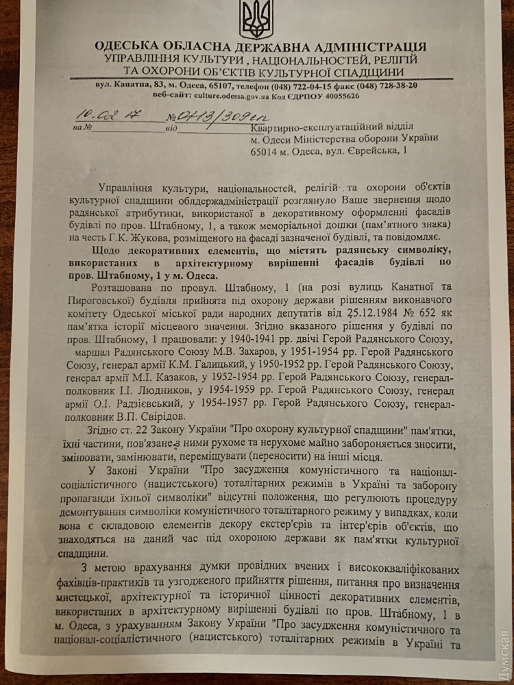 Вместе с тем, говорит Воробьева, балансодержателем здания, на котором был расположен барельеф Жукова, выступает Южное территориальное квартирно-эксплуатационное управление Министерства обороны Украины, а значит вся ответственность за сохранность памятника лежит на военных.