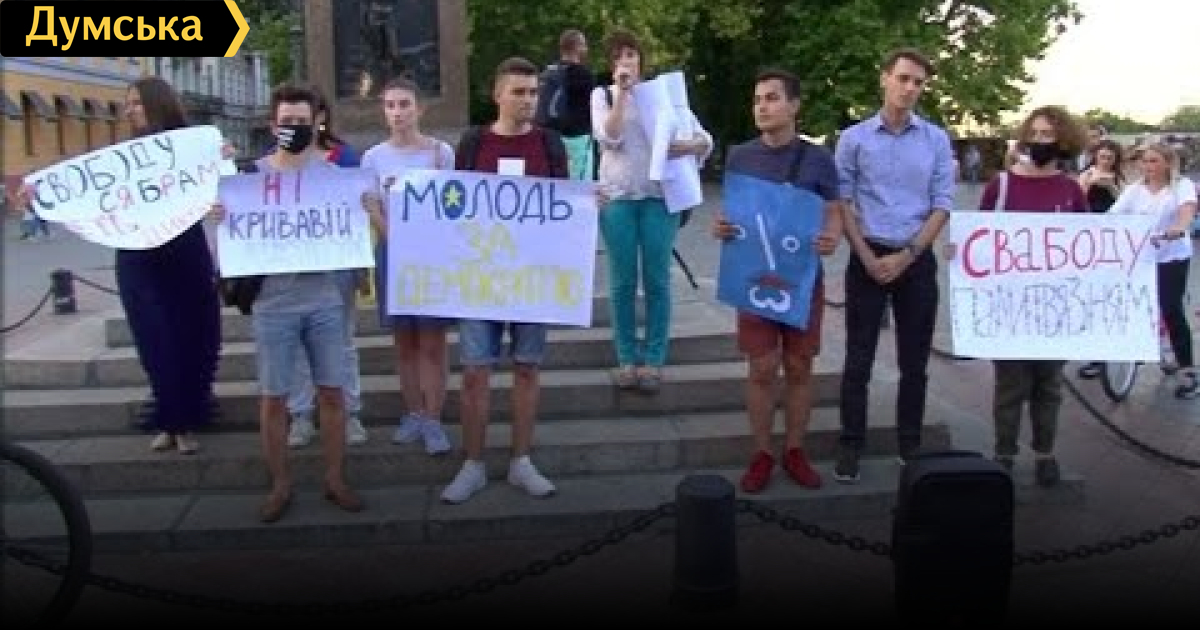 Около 200 одесситов собрались, чтобы поддержать белорусов в их борьбе за свободу. Дюка нарядили в красно-белый флаг — с таким митингующие выходят на акции протеста