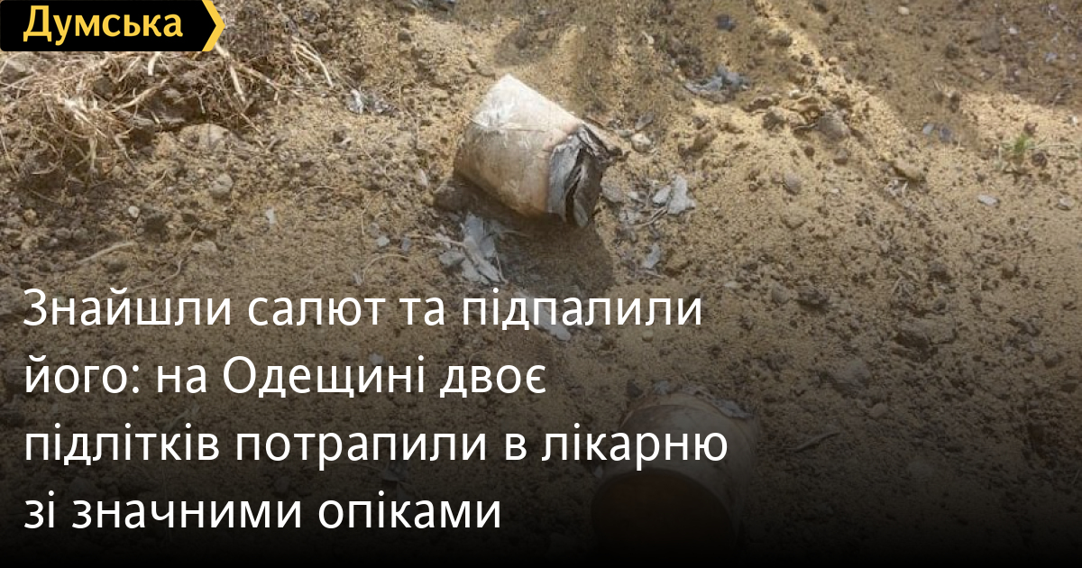 Знайшли салют та підпалили його: на Одещині двоє підлітків потрапили в лікарню зі значними опікамиДвох підлітків з термічно-хімічними опіками другого ступеня шпиталізували в Роздільнянському районі. Друзі віком 13 та 15 років знайшли салют та вирішили підпалити його сірниками, повідомили в поліції регіону. Подія сталася у селищі Захарівка. Хлопці грались неподалік дому, де, як вони розповідають, знайшли піротехніку у вигляді циліндра. Щойно підлітки підпалили його сірниками, як салют вибухнув. Підлітки побігли додому та розказали все батькам, і ті викликали швидку. Дітей доставили до місцевої лікарні з опіками обличчя та рук ІІ ступеня. Наразі життю юних пацієнтів нічого не загрожує. На місці події продовжують працювати інспектор ювенальної превенції, слідчий та криміналіст. Повні обставини події встановлюються. СМЕРТЬ РОСІЙСЬКИМ ОКУПАНТАМ! Помітили помилку? Виділяйте слова з помилкою та натискайте control-enter |