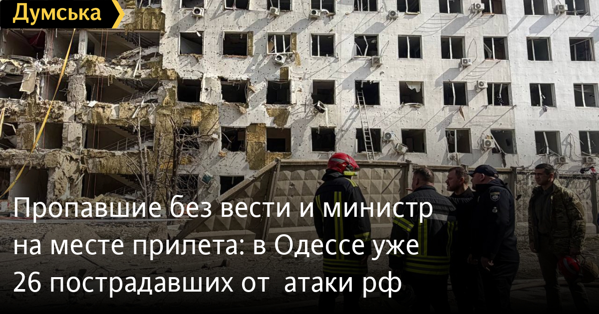 Пропавшие без вести и министр на месте прилета: в Одессе уже 26 пострадавших от атаки рфРабота по ликвидации последствий ночного удара рф по жилому дому продолжается, так как есть информация о пропавших без вести. Как сообщил глава ГВА Сергей Лысак, на месте находятся министр внутренних дел Игорь Клименко и глава ГСЧС Андрей Даник. На данный момент известно уже о 26 пострадавших. «С первой минуты трагедии на месте работают все службы: спасатели, следователи, криминалисты, психологи, кинологи, районная администрация и коммунальщики», — отметил Лысак. Председатель ОГА Олег Кипер добавил, что зафиксировано попадание БПЛА в гражданское грузовое судно под флагом Науру, с последующим возгоранием одного из контейнеров. Пожар ликвидировал экипаж, и судно продолжило движение. Информация о погибших и пострадавших не поступала. Напомним, в результате удара погибли восемь человек. Повреждены общежития, объекты энергетической и критической инфраструктуры, а также жилые дома. СМЕРТЬ РОССИЙСКИМ ОККУПАНТАМ! Заметили ошибку? Выделяйте слова с ошибкой и нажимайте control-enter