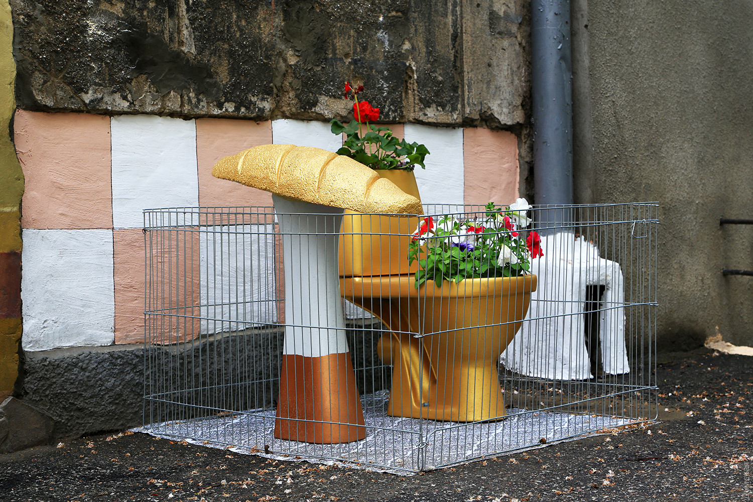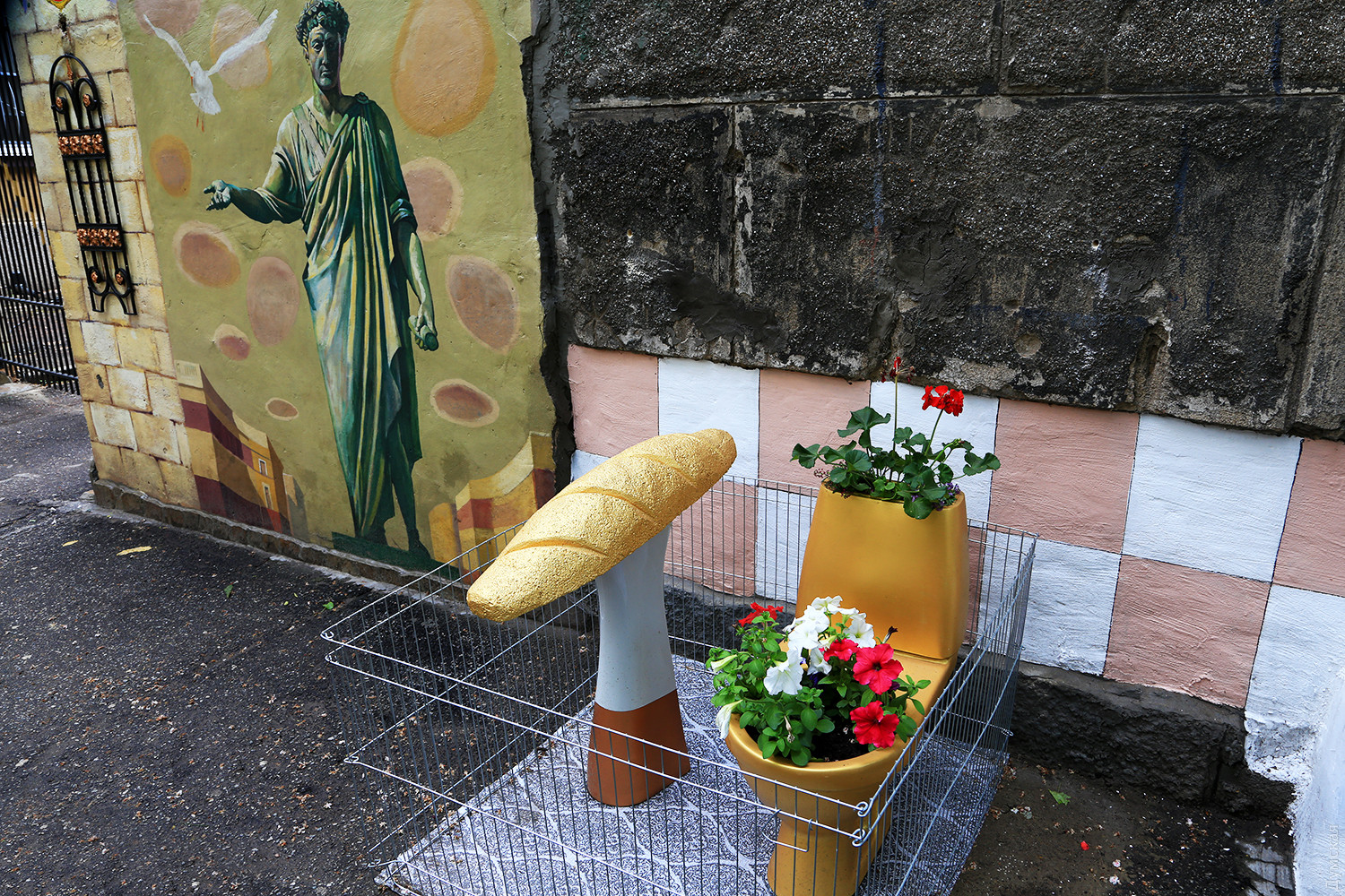 Инсталляция, включающая в себя основные символы режима Виктора Януковича и цветник, выросла рядом с домом №1/3. Батон возвышается на постаменте, а золотое чудо сантехники внутри украшено цветами и огорожено от вандалов небольшой металлической оградкой. Композиция окрашена ярким золотистым металликом и очень похожа на настоящие атрибуты «легитимного».