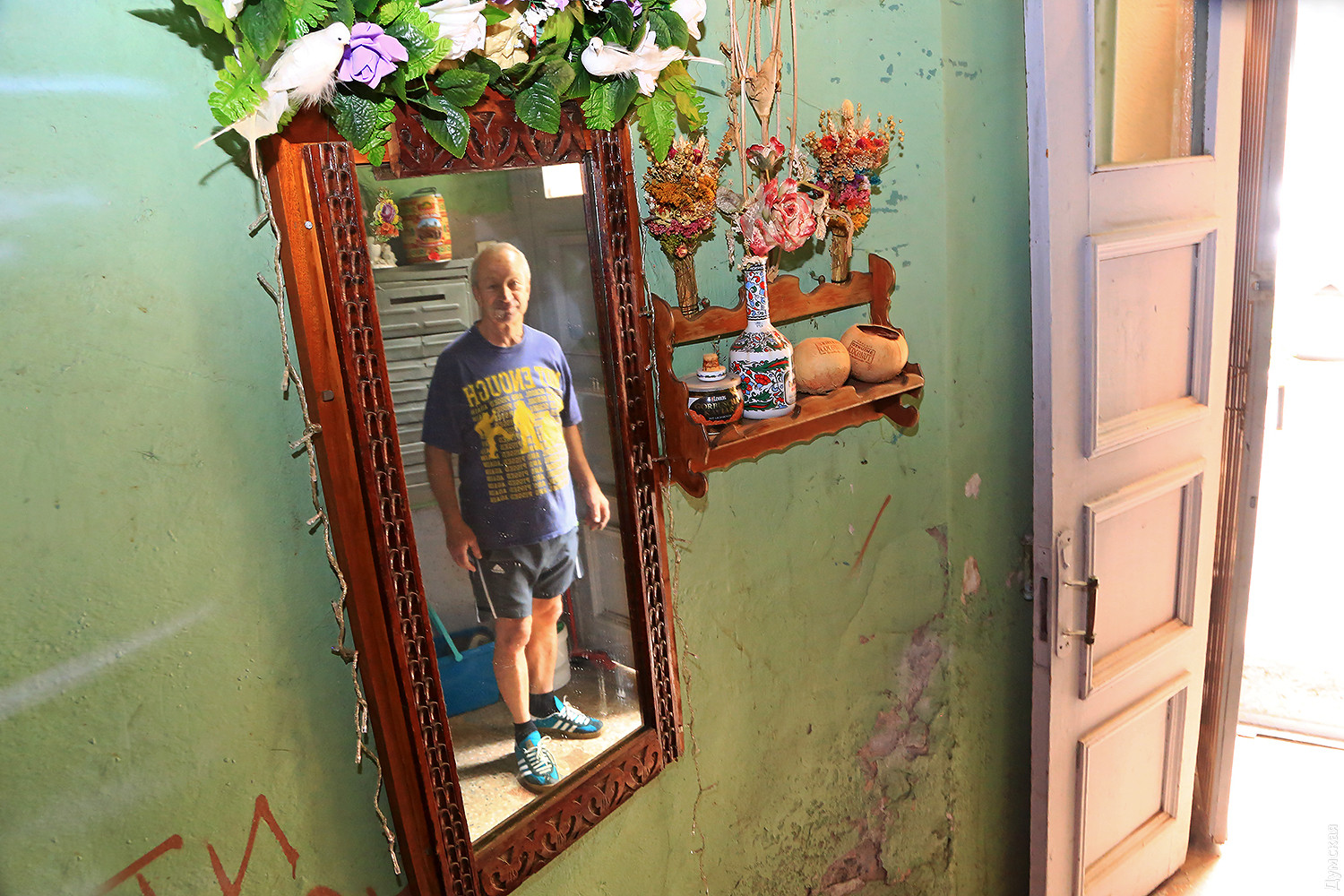 На лестничной клетке своего дома Игорь Васильевич сделал ремонт и украсил стены рисунками. Везде цветы, игрушки и даже зеркала.