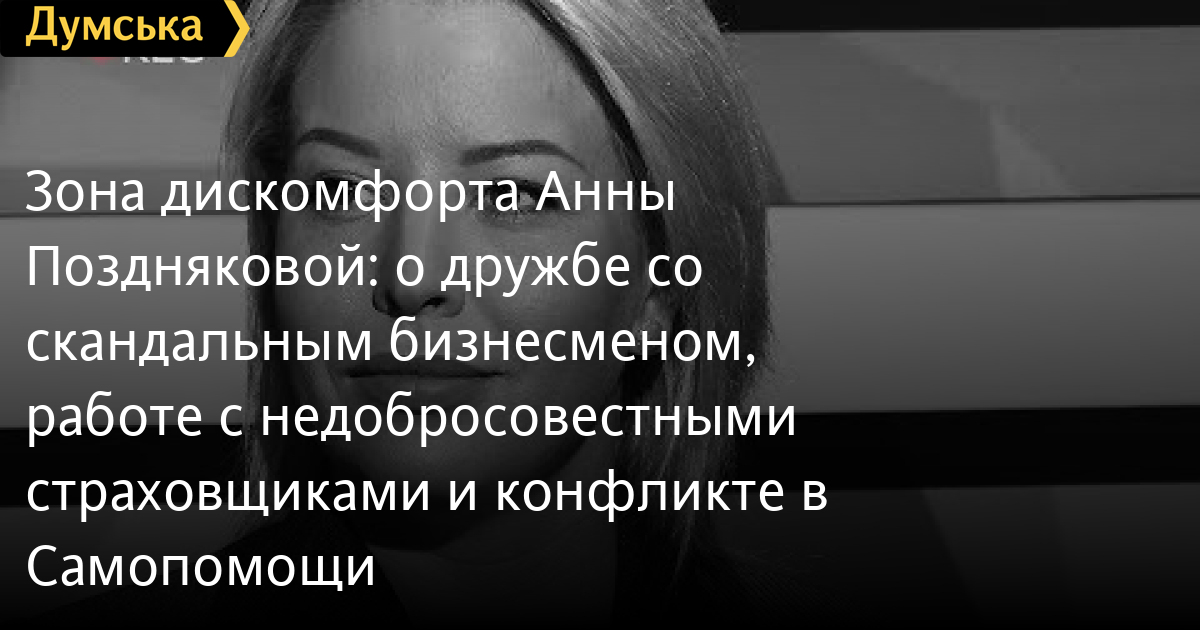 «Зона дискомфорта» Анны Поздняковой: о дружбе со скандальным бизнесменом, работе с недобросовестными страховщиками и конфликте в «Самопомощи»Вышел новый выпуск программы «Зона дискомфорта». На этот раз гостем программы стала депутат Одесского горсовета Анна Позднякова. Депутат рассказала, как начинала свой трудовой путь в компании с неоднозначной репутацией — ЗАО «Страховой дом», которая обманула десятки клиентов; о своем сотрудничестве со скандальным бизнесменом Леонидом Фуксом, а также о конфликтах в партии «Самопомощь». СМЕРТЬ РОССИЙСКИМ ОККУПАНТАМ! Заметили ошибку? Выделяйте слова с ошибкой и нажимайте control-enter |