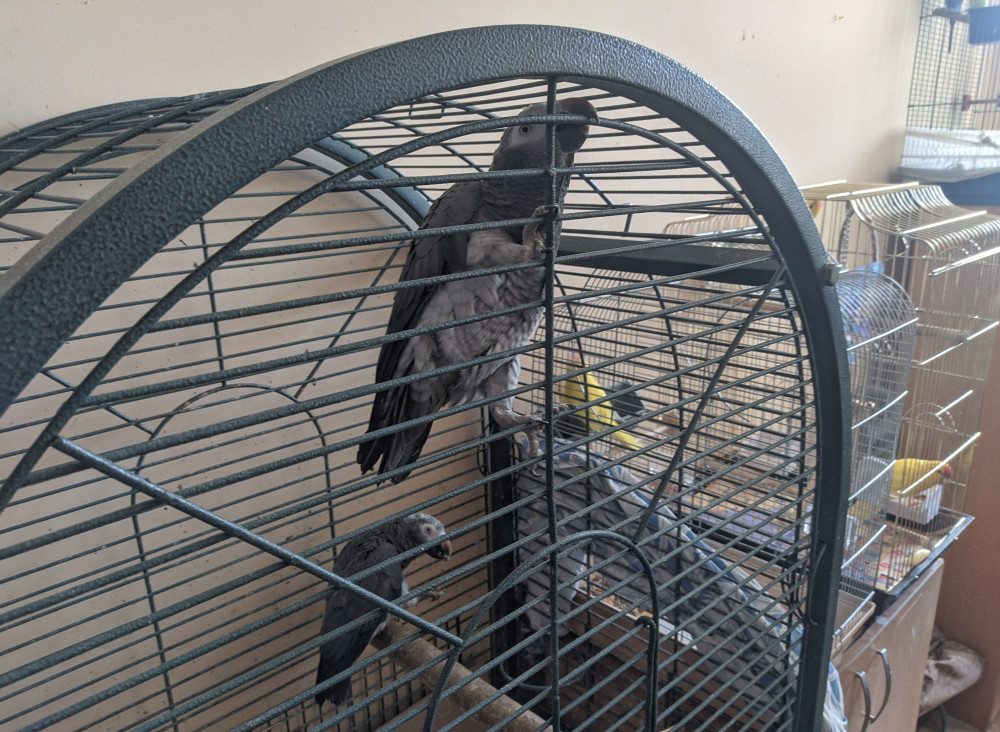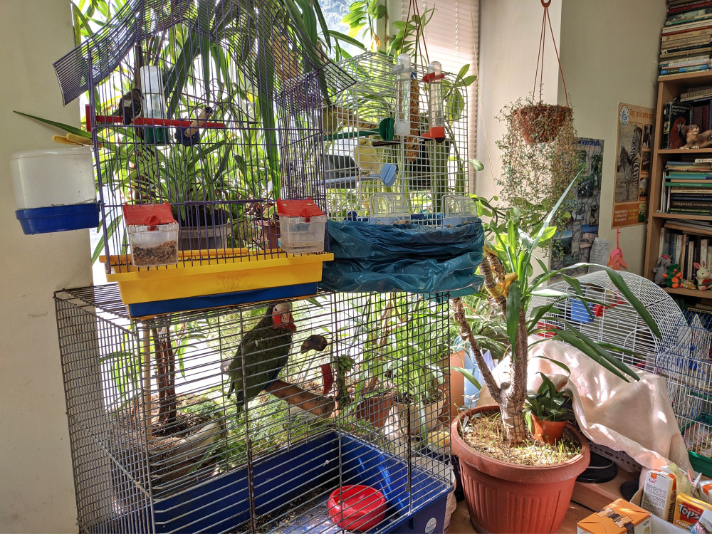 В кабинете у сотрудницы зоопарка Ольги Павловой разместили птиц, в основном попугаев. Клетки на столе стоят в несколько ярусов. Для рабочего ноутбука место нашлось с трудом.